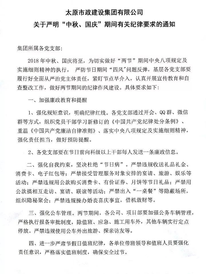 太原市政建設(shè)集團有限公司關(guān)于嚴明“中秋、國慶”期間有關(guān)紀(jì)律要求的通知