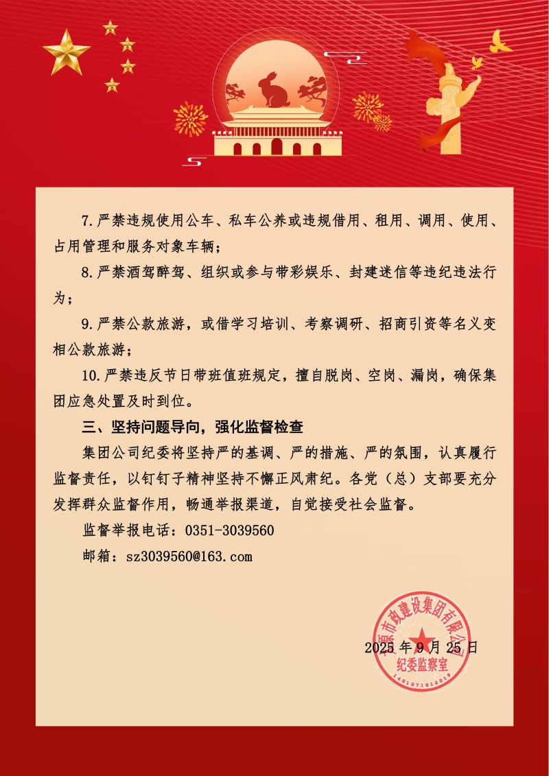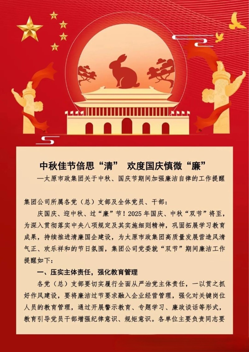 太原市政集團關于中秋、國慶節期間加強廉潔自律的工作提醒