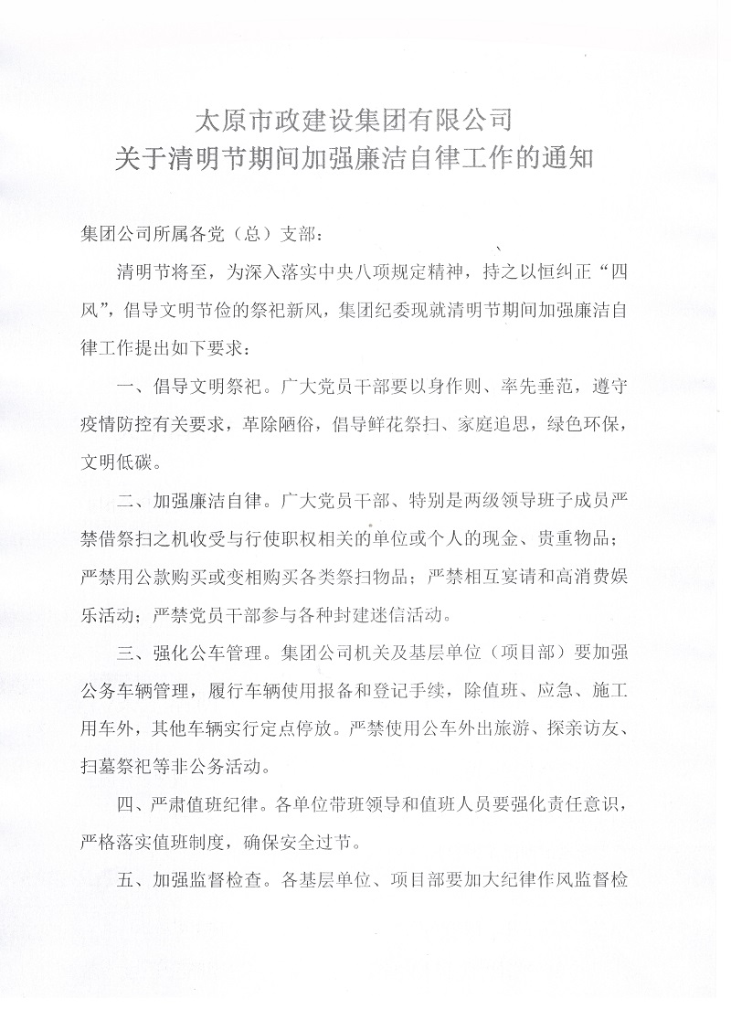 太原市政建設集團有限公司關于清明節期間加強廉潔自律工作的通知