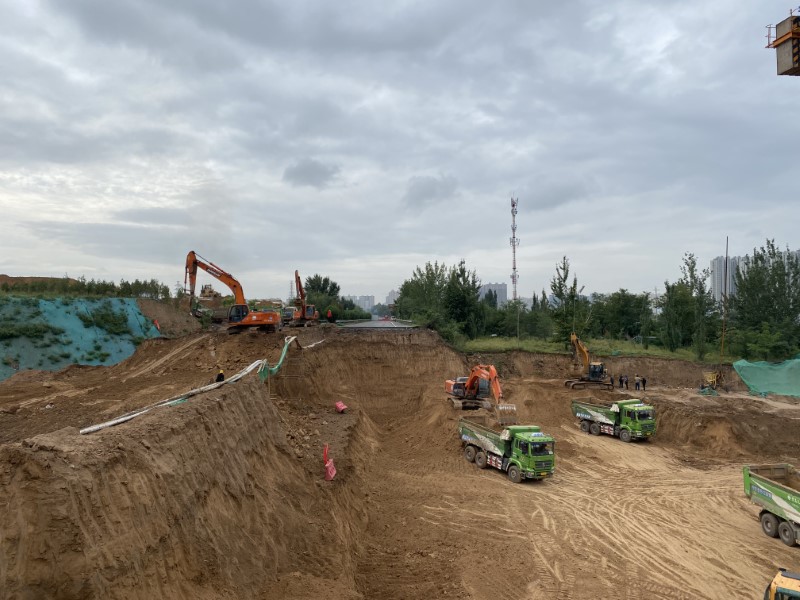 迎澤大街東延建設工程長約1.25公里,寬70米,建設內容包括道路、地道、擋墻、排水、電力等,于2021年5月開工建設,由八公司負責承建。根據現場施工條件,該工程全線形成多點開花、分段作業的局面,多道工序在施工作業面同時展開、互不影響,有效壓縮了工序間的銜接時間。施工期間,項目部主動配合國家電網、鐵路等部門,加快推進配電室改遷、10千伏水源線入地等作業,確保工程順利進行。施工中,項目部嚴控溝槽開挖,結合溝槽開挖較深且周期較長的情況,采用放坡開挖并打設鋼板樁的方式對土體進行加固支護,提升基坑整體穩定性,保證成型質量;強化溝槽回填,項目部采取管頂500毫米以下進行人工回填,管頂500毫米以上利用機械分層進行回填的方式,有效保證溝槽回填質量達到施工要求。同時,該工程臨近居民區,項目部全力做好安全施工,在圍擋、標識牌、警示標語、防護設施、灑水降塵等方面處處把關,嚴格要求,優質高效推進工程建設,全力打造安全文明標準化工地,并結合施工實際,修建臨時便道,解決下雨出行難的實際問題,保證居民日常出行安全,得到了居民們的交口稱贊。全體參建人員擼起袖子、鼓足干勁,保質保量完成各項施工任務,作為“三晉第一街”的迎澤大街也以嶄新面貌出現在廣大市民面前,成為連接東西兩山的一條通衢大道。