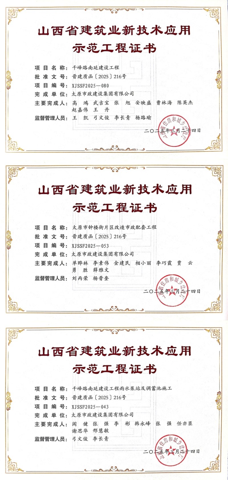 簡訊一:近日,由集團公司承建的千峰路南延建設工程雨水泵站及調蓄池施工、太原市鐘樓街片區(qū)改造市政配套工程、千峰路南延建設工程被山西省住房和城鄉(xiāng)建設廳評為“山西省新技術應用示范工程”。
