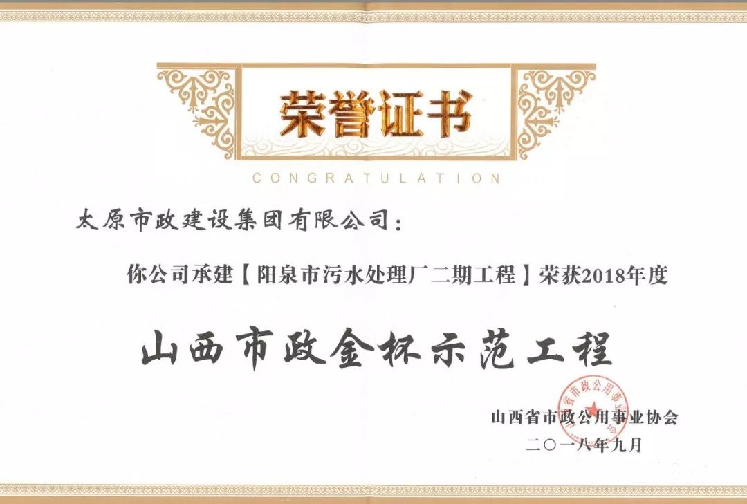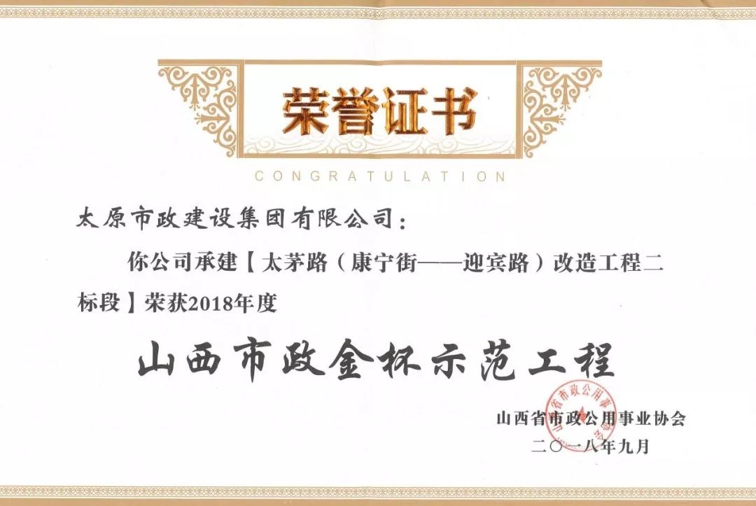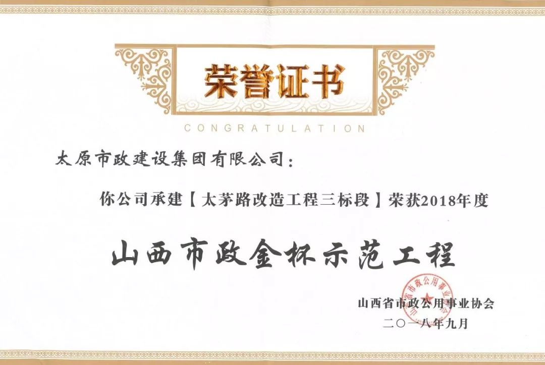 9月20日,太原市政建設(shè)集團有限公司承建的太茅路改造工程三標(biāo)段、陽泉市污水處理廠二期工程、上莊街(西中環(huán)——少管所三岔口)道路改造工程、太茅路(康寧街——迎賓路)改造工程二標(biāo)段榮獲山西省市政公用事業(yè)協(xié)會頒發(fā)的2018年度“山西市政金杯示范工程”榮譽稱號。