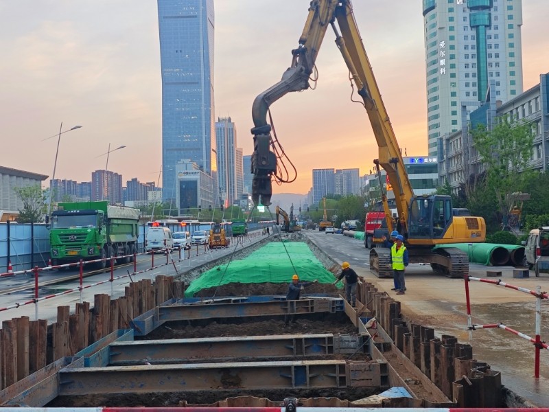 “追求精細(xì)極致,鑄就基坑支護(hù)的穩(wěn)固防線”。項(xiàng)目部將鋼板樁施打質(zhì)量視為確保基坑安全與質(zhì)量的關(guān)鍵環(huán)節(jié),嚴(yán)格執(zhí)行材料準(zhǔn)入制度,所有進(jìn)場鋼板樁均經(jīng)過材質(zhì)證明核查、尺寸精度測量和外觀質(zhì)量檢驗(yàn)三重把關(guān),確保樁身無裂紋、無銹蝕等質(zhì)量缺陷,從源頭上杜絕不合格材料。施工中,施工人員采用全站儀進(jìn)行動(dòng)態(tài)監(jiān)測,嚴(yán)格控制樁身垂直度偏差在規(guī)定范圍內(nèi),詳細(xì)記錄每根樁的打入深度、貫入度等關(guān)鍵參數(shù)。拔樁階段采用專用施工設(shè)備,按照“先支后拆、分段拔除”的原則有序進(jìn)行,拔樁后出現(xiàn)的孔隙立即灌砂,最大限度減少對(duì)周邊土體的擾動(dòng),實(shí)現(xiàn)平穩(wěn)施工與環(huán)境保護(hù)的和諧統(tǒng)一。