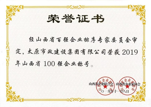 11月8日,山西省企業聯合會、山西省企業家協會攜手山西財經大學向社會發布“山西企業100強排行榜”,同時發布《山西企業100強(年度)發展報告》。太原市政建設集團有限公司榮獲“2019年山西省100強企業”稱號,排名第39位。