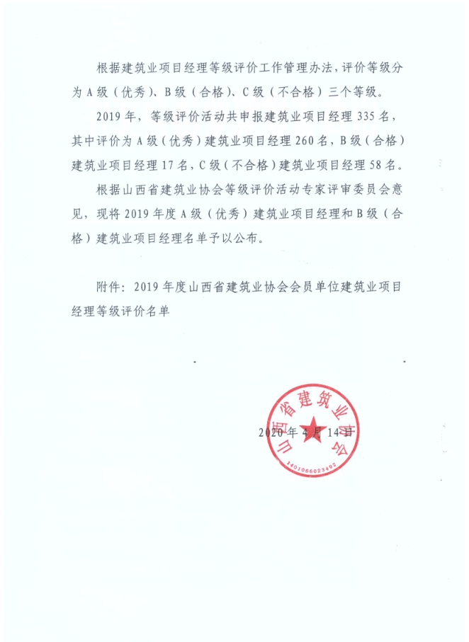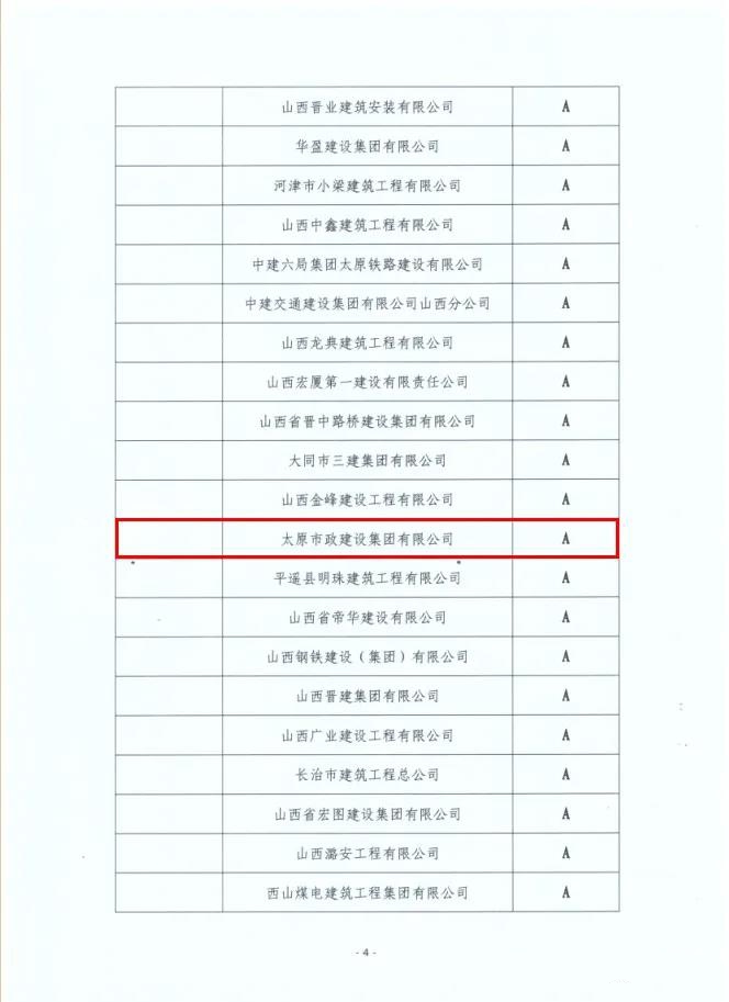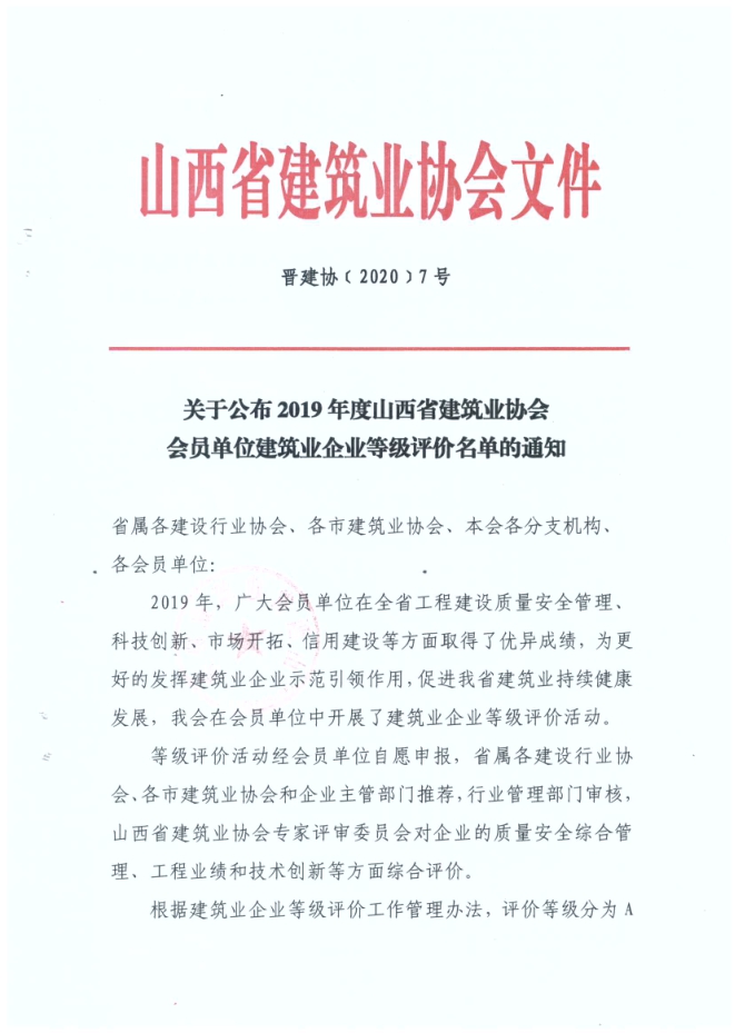 近日,山西省建筑業(yè)協(xié)會公布2019年度建筑業(yè)企業(yè)等級評價名單,集團(tuán)公司被評為2019年度山西省A級(優(yōu)秀)建筑業(yè)企業(yè)。
