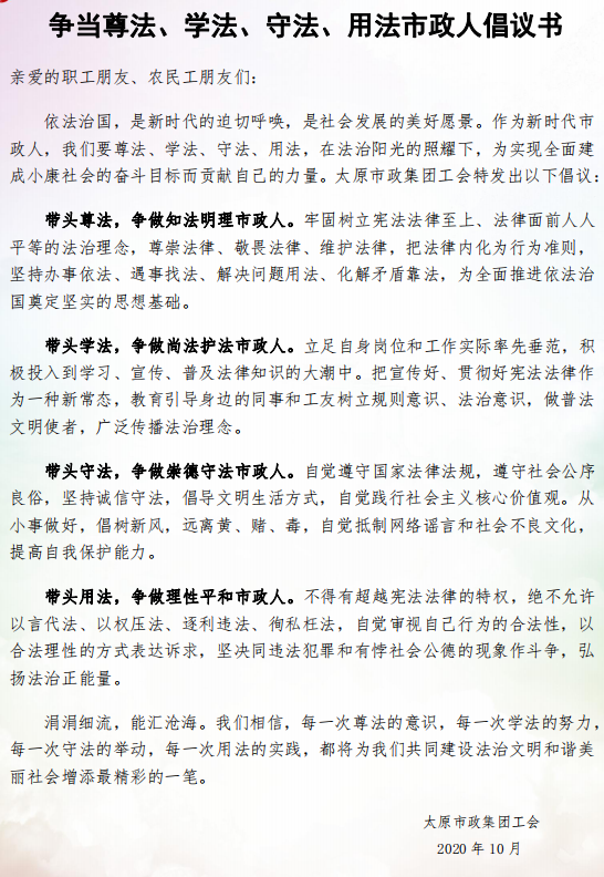 活動中,律師事務(wù)所的5名律師現(xiàn)場為職工、農(nóng)民工進(jìn)行了法律宣傳和咨詢。集團(tuán)公司工會工作人員為大家發(fā)放了《爭當(dāng)尊法、學(xué)法、守法、用法市政人倡議書》、法律宣傳資料以及活動紀(jì)念品。同時,參加活動的職工和農(nóng)民工在2020年“尊法守法 攜手筑夢”服務(wù)農(nóng)民工法制宣傳行動條幅上簽名。