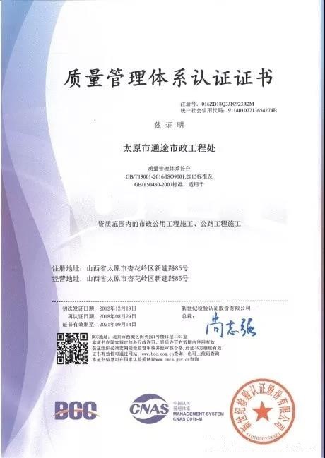 本次認證審核工作得到了審核組的充分肯定,進一步促進了通途市政工程處生產經營管理的規(guī)范化、科學化。